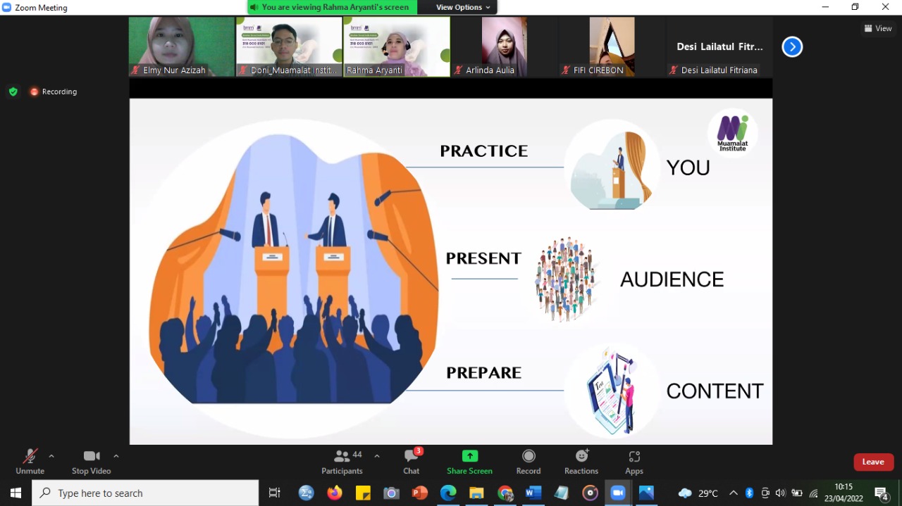Sabtu, 23/04/2022, Fakultas Ekonomi dan Bisnis, Uhamka (FEB Uhamka) mengutus beberapa dosen untuk mengikuti pelatihan public speaking yang diselenggarakan Muamalat Institute. Kegiatan ini merupakan salah satu implementasi dari Perjanjian Kerjasama antara FEB Uhamka dan Mumamalat Institute yang ditandatangani beberap bulan yang lalu.