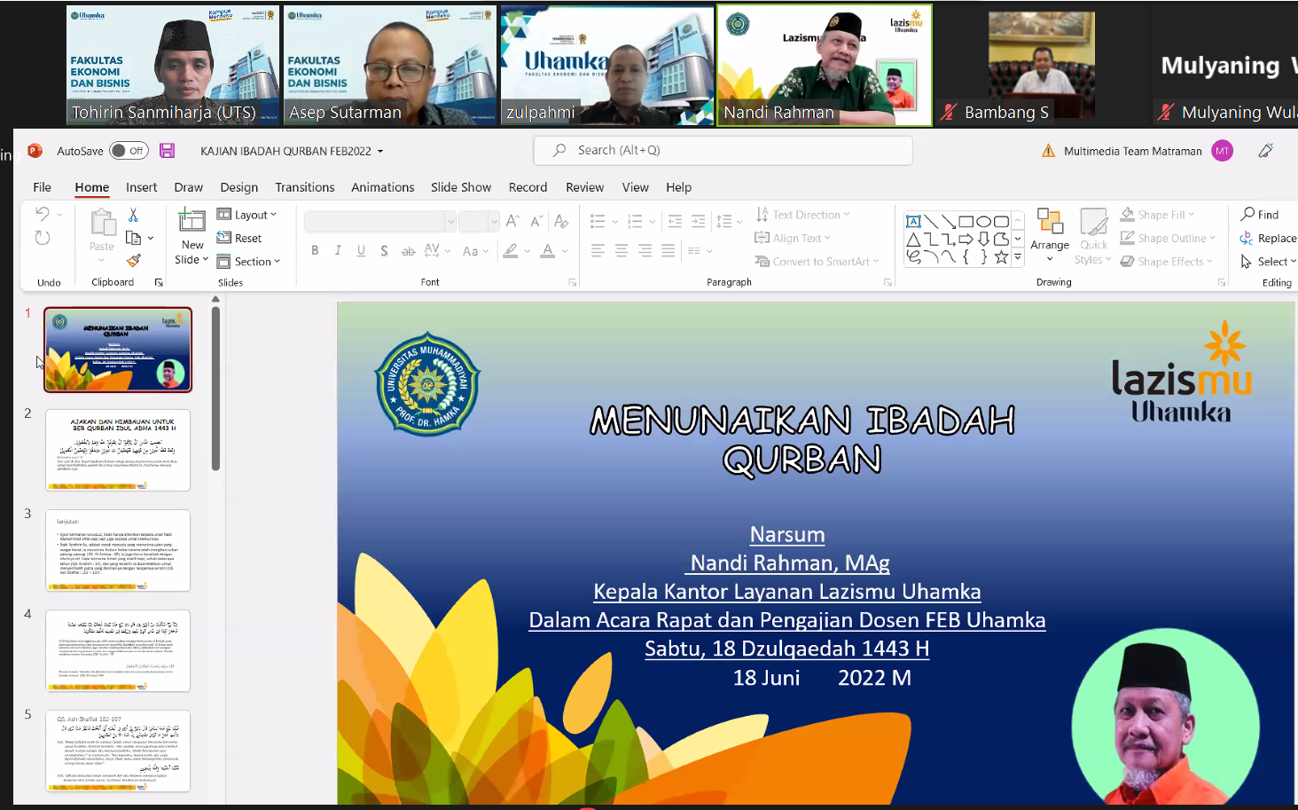 Hadir pada acara tersebut para pimpinan FEB Uhamka mulai dari Dekan, para Wakil Dekan, hingga Kaprodi. Peserta dosen dan karyawan yang hadir sebanyak 70 orang. Acara dilakukan melalui zoom meeting karena secara kebetulan berbarengan dengan beberapa acara di kampus secara offline, sedangkan kampus masih melakukan pembatasan untuk mengantisipasi hal-hal yang tak diinginkan karena covid-19.