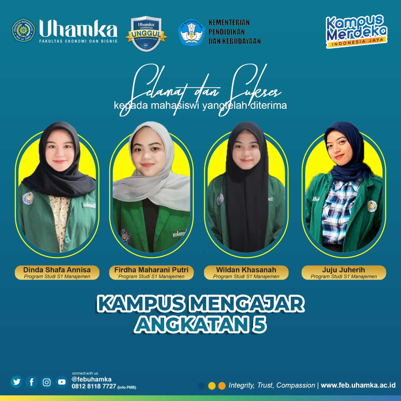 Pada Program Kampus Mengajar Angkatan 5 tahun 2023 ini Fakultas Ekonomi dan Bisnis UHAMKA (FEB UHAMKA) turut berkontribusi dengan lolosnya 4 (empat) orang mahasiswa dari FEB UHAMKA.