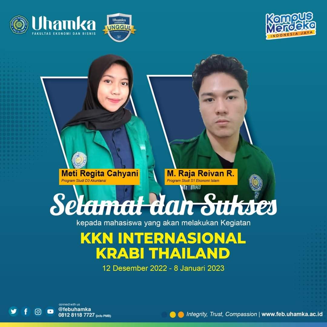 Fakultas Ekonomi dan Bisnis UHAMKA mengirimkan 2 (dua) mahasiswa untuk ikut melakukan Kuliah Kerja Nyata Internasional di Eakkapapsasana Wich School Krabi, Thailand. Kegiatan KKN Internasional ini merupakan salah satu...