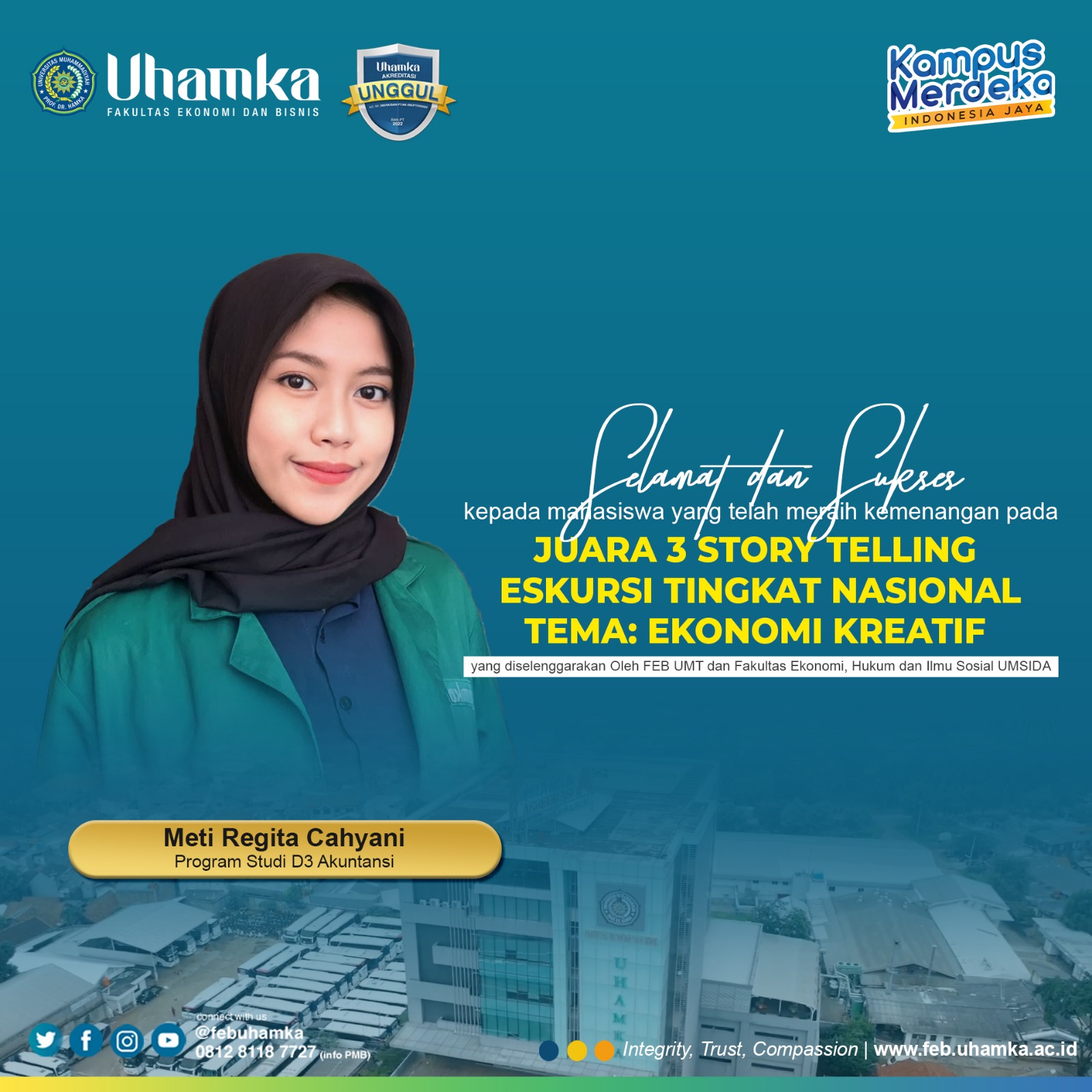 Fakultas Ekonomi dan Bisnis UHAMKA berhasil mengamankan posisi ketiga dalam kejuaran Story Telling Eskursi Tingkat Nasional Tema: Ekonomi Kreatif Tingkat Nasional yang diadakan oleh FBHIS UMSIDA (Fakultas Bisnis, Hukum,...