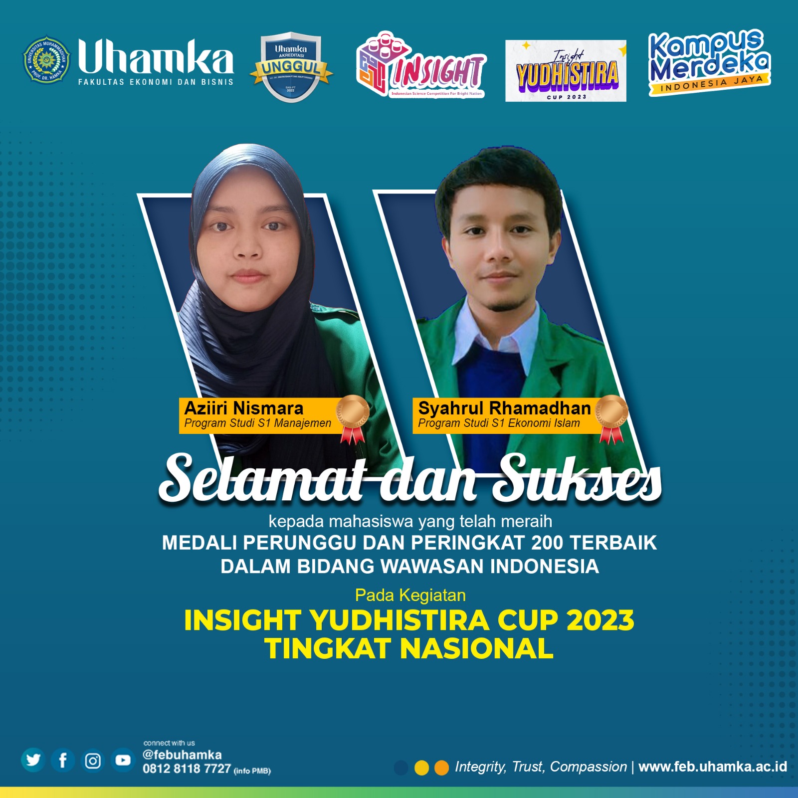Mahasiswa Fakultas Ekonomi dan Bisnis UHAMKA berhasil meraih penghargaan dalam kategori wawasan Indonesia pada kegiatan Insight Yudhistira Cup 2023 Tingkat Nasional yang diselenggarakan oleh Indonesia Science Competition for Bright...